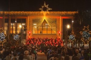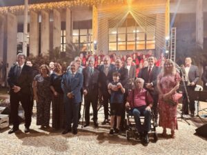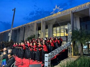 A entrada principal do Tribunal de Justiça de Mato Grosso do Sul, no Parque dos Poderes, se transformou em palco na noite desta sexta-feira, 28 de novembro, para receber a tradicional Cantata de Natal do Poder Judiciário. Em 2025, a tradicional celebração de fim de ano da corte sul-mato-grossense reuniu magistrados, servidores, familiares e visitantes que se acompanharam a apresentação do Coral do TJMS, sob a regência do maestro Nolo Cunha.
