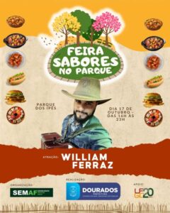 A Feira Sabores no Parque promete mais uma noite de boa música, gastronomia e lazer nesta sexta-feira (17), no Parque dos Ipês, em Dourados. O evento contará com a apresentação do cantor Willian Ferraz, que trará um repertório eclético para animar o público e garantir um ambiente de descontração e entretenimento. “Estamos seguindo a determinação do prefeito Marçal Filho, que é de criar novas opções de lazer, entretenimento e bem estar aliadas com oportunidades de negócios para os artesãos, pequenos comerciantes do setor de alimentos e pequenos produtores rurais”, enfatiza Bruno Pontim, secretário municipal de Agricultura Familiar e responsável pelo setor de feiras-livres em Dourados.