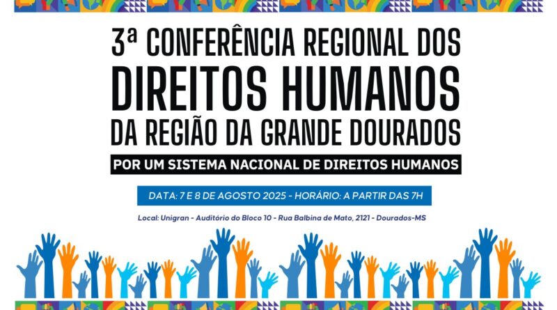 Nos dias 7 e 8 de agosto, Dourados será palco da 3ª Conferência Regional de Direitos Humanos e Cidadania, que acontece no auditório do Bloco 10 da Unigran, parceira institucional do evento. Com o tema central “Por um Sistema Nacional de Direitos Humanos: Consolidar a Democracia, Resistir aos Retrocessos e Avançar na Garantia de Direitos para Todas as Pessoas”, a conferência reunirá representantes de 13 municípios da região da Grande Dourados.