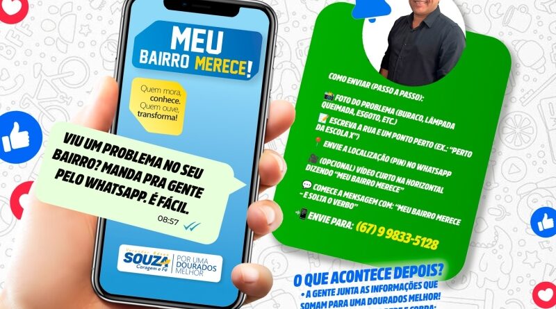 Com o objetivo de ampliar a participação popular e aproximar ainda mais o mandato da comunidade douradense, o vereador Edson Souza (União Brasil) lançou o programa “Meu Bairro Merece”, um canal direto para que moradores enviem solicitações, denúncias, fotos, vídeos e sugestões de melhorias para os bairros da cidade.