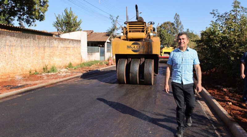 A Prefeitura de Dourados está avançando com obras de pavimentação e drenagem em bairros de Dourados. Na manhã desta quarta-feira, o prefeito Marçal Filho vistoriou a obra de asfalto na Rua Bento Pereira de Matos, na Vila Esperança e destacou como a ação vai transformar a realidade dos moradores da região. “Olha como está ficando bom o asfalto, isso é segurança, asfalto é conforto, é saúde, é valorização das casas e de toda região”, apontou o prefeito.